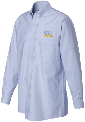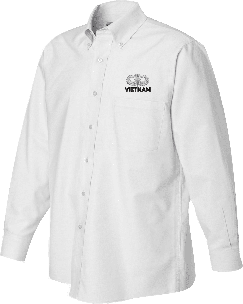 Note: Some of the Color Options pictured may not be available. Available Color Options are listed on the drop down menu above.MilitaryBest has expanded its line of apparel with this custom embroidered U.S. Army Vietnam Jump Wings Oxford Shirt. This Van Heusen brand Oxford long sleeve button down dress shirt is made using a wrinkle-free, pill and stain resistant 60/40 cotton/polyester material. This U.S. Army Vietnam Jump Wings Oxford Shirt will make an excellent addition to your wardrobe or a quality gift. This U.S. Army Vietnam Jump Wings Oxford Shirt is custom embroidered at our facilities in Scottsboro, Alabama.