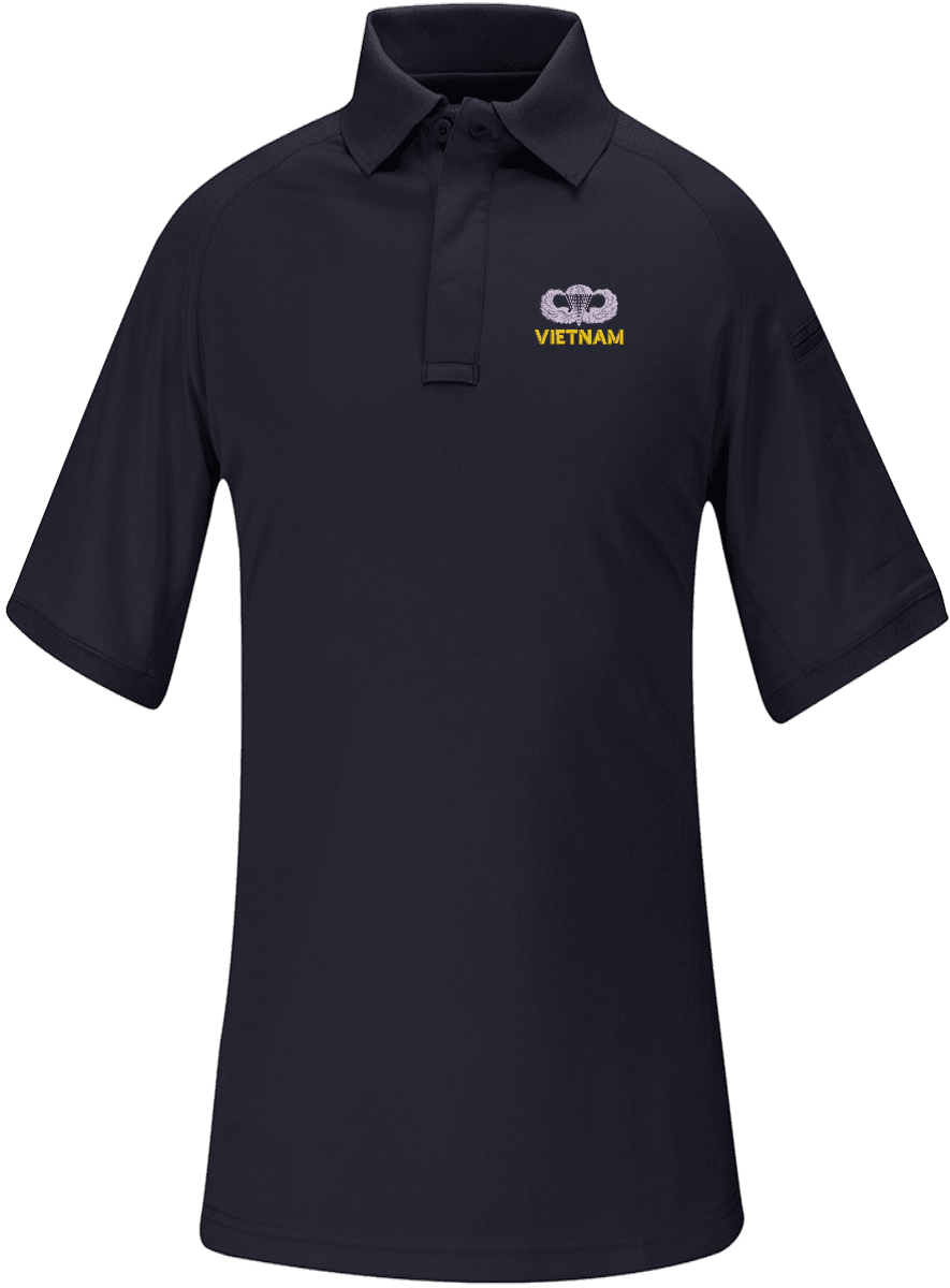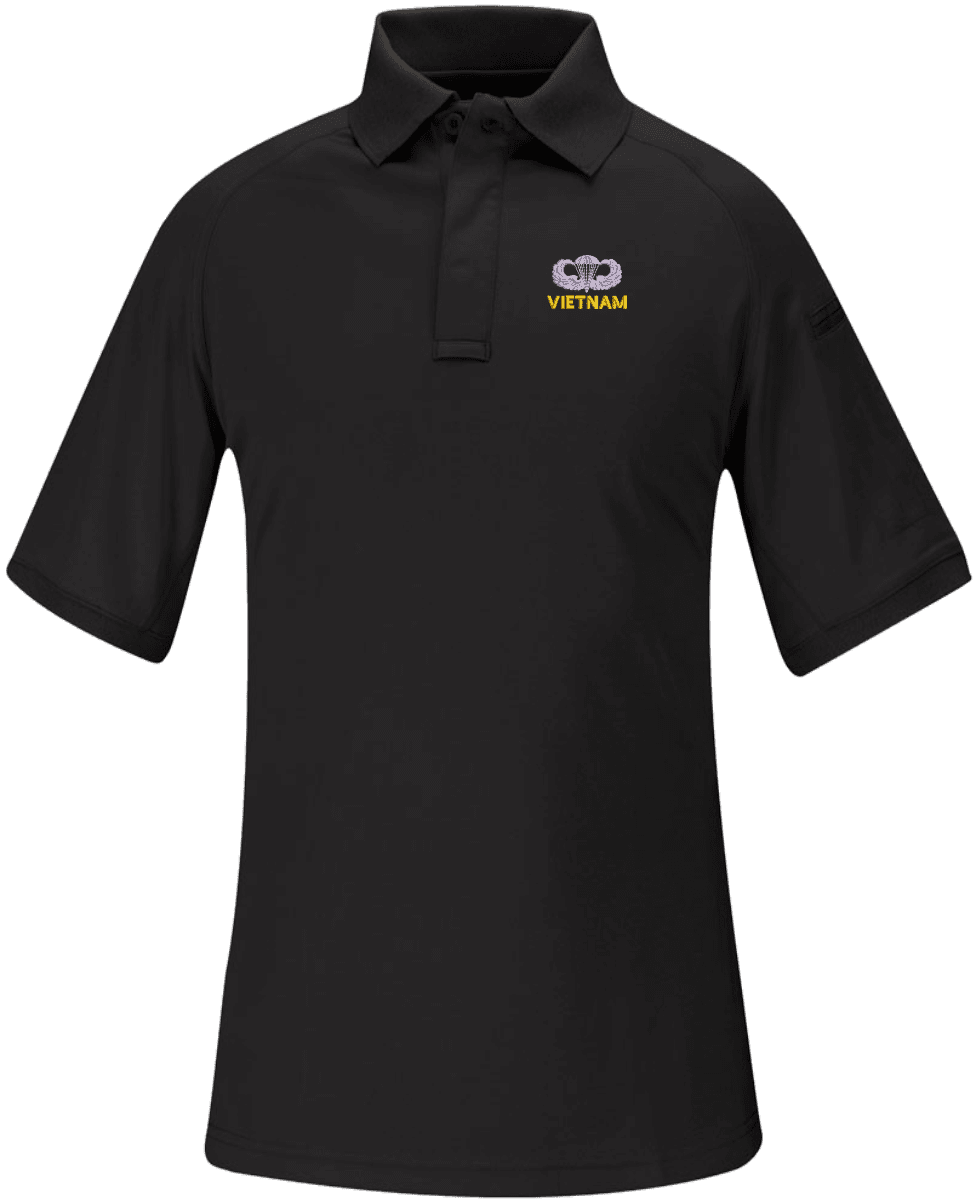 Note: Some of the Color Options pictured may not be available. Available Color Options are listed on the drop down menu above.MilitaryBest has expanded its line of apparel with this custom embroidered U.S. Army Vietnam Jump Wings Propper Snag Free Polo. Each polo is made using a Propper Snag Free 100% polyester moisture wicking material. This U.S. Army Vietnam Jump Wings Propper Snag Free Polo will make an excellent addition to your wardrobe, or a great gift. Your satisfaction is guaranteed! Each U.S. Army Vietnam Jump Wings Propper Snag Free Polo is directly embroidered at our facilities in Scottsboro, AL.