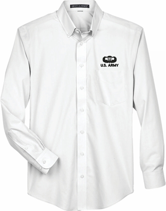 MilitaryBest has expanded its line of apparel with this U.S. Army Jump Wings with Text Embroidered Dress Shirt. This long sleeve button down dress shirt is made using a stain-release, wrinkle-free, 55% cotton/45% polyester material. The pocket over the left chest measures 4 3/4" across. Featuring a U.S. Army Jump Wings with Text design above the pocket, this shirt is embroidered to order at our facilities in Scottsboro, AL..- 55% cotton/45% polyester