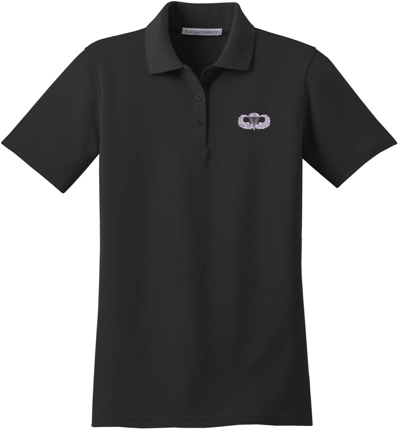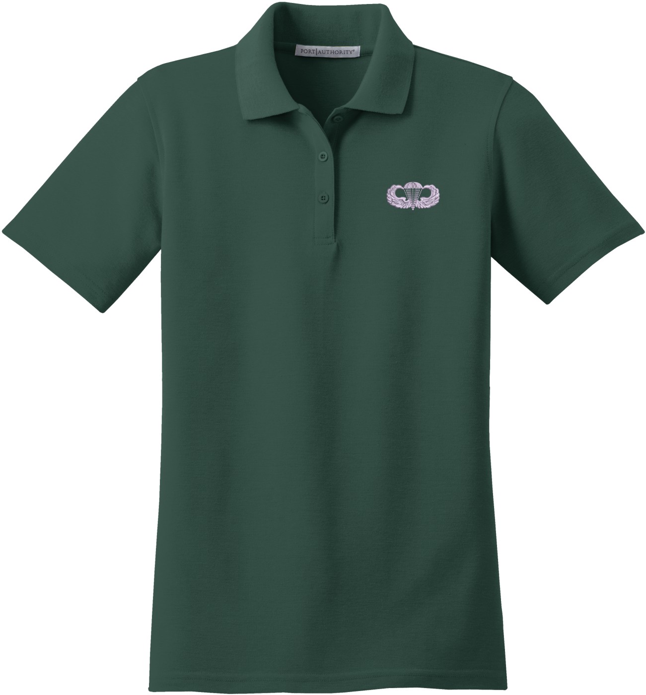 MilitaryBest is proud to offer this U.S. Army Jump Wings Women's Stain-Release Polo. This polo is embroidered by our MilitaryBest team in Northeast Alabama. These polos are made with a stain-release finish for long-lasting wear, odor-fighting properties, and superior wrinkle and shrink resistance.Care Instructions: Machine Wash Cold With Like Colors. Do Not Use Fabric Softener. Do Not Bleach. Tumble Dry Low. Warm Iron If Necessary.