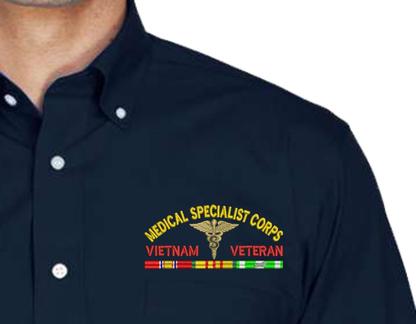MilitaryBest has expanded its line of apparel with this U.S. Army Medical Specialist Corps Vietnam Veteran Embroidered Dress Shirt. This long sleeve button down dress shirt is made using a stain-release, wrinkle-free, 55% cotton/45% polyester material. The pocket over the left chest measures 4 3/4" across. Featuring a U.S. Army Medical Specialist Corps Vietnam Veteran design above the pocket, this shirt is embroidered to order at our facilities in Scottsboro, AL..- 55% cotton/45% polyester