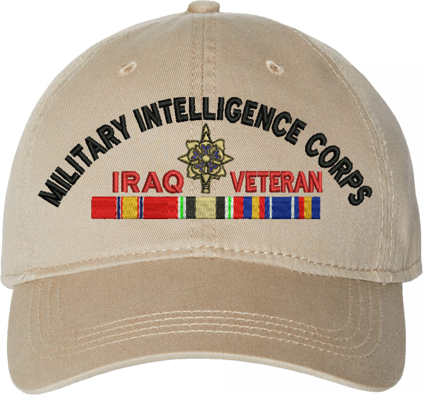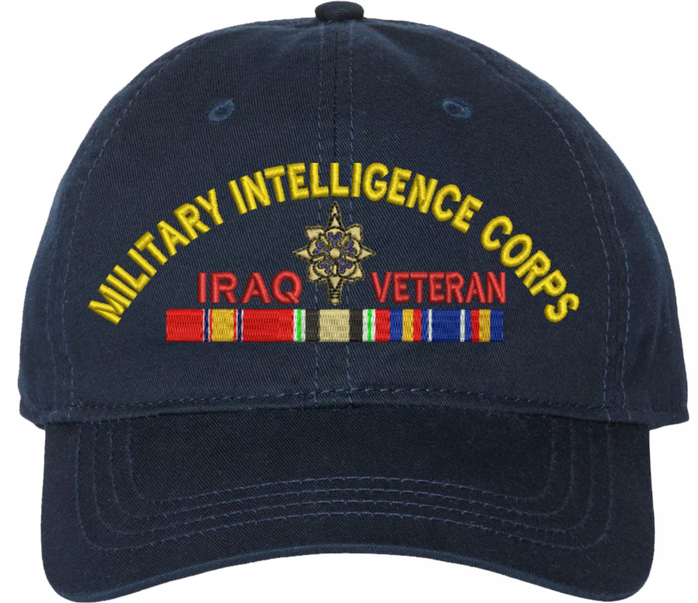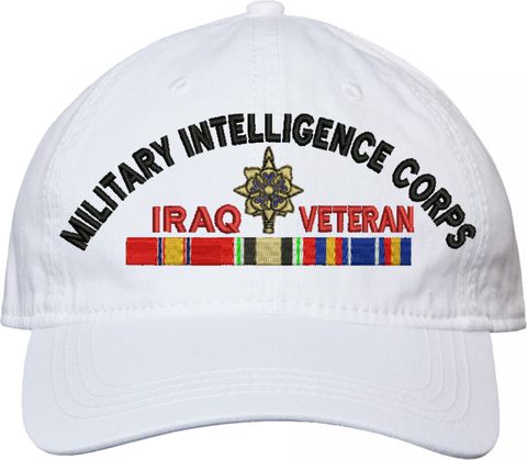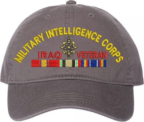 Show your Army pride with this U.S. Army Military Intelligence Corps Iraq Veteran Unstructured Dad Cap from MilitaryBest. Crafted from 100% washed chino twill cotton, this six-panel, low-profile cap offers a relaxed and comfortable fit. Featuring high-quality embroidery done in our Scottsboro, Alabama facility, this cap is designed with a pre-curved visor and an adjustable tri-glide buckle closure for a perfect fit. Whether for everyday wear or as a meaningful gift, this cap is a great way to honor your own or a loved one's service.For caps ordered with custom embroidered personalized text please allow an additional 3 to 5 days production time. All custom back text will be embroidered in ALL CAPITAL LETTERS. Caps with back text or eggs are non-returnable unless there is a material defect in the cap.