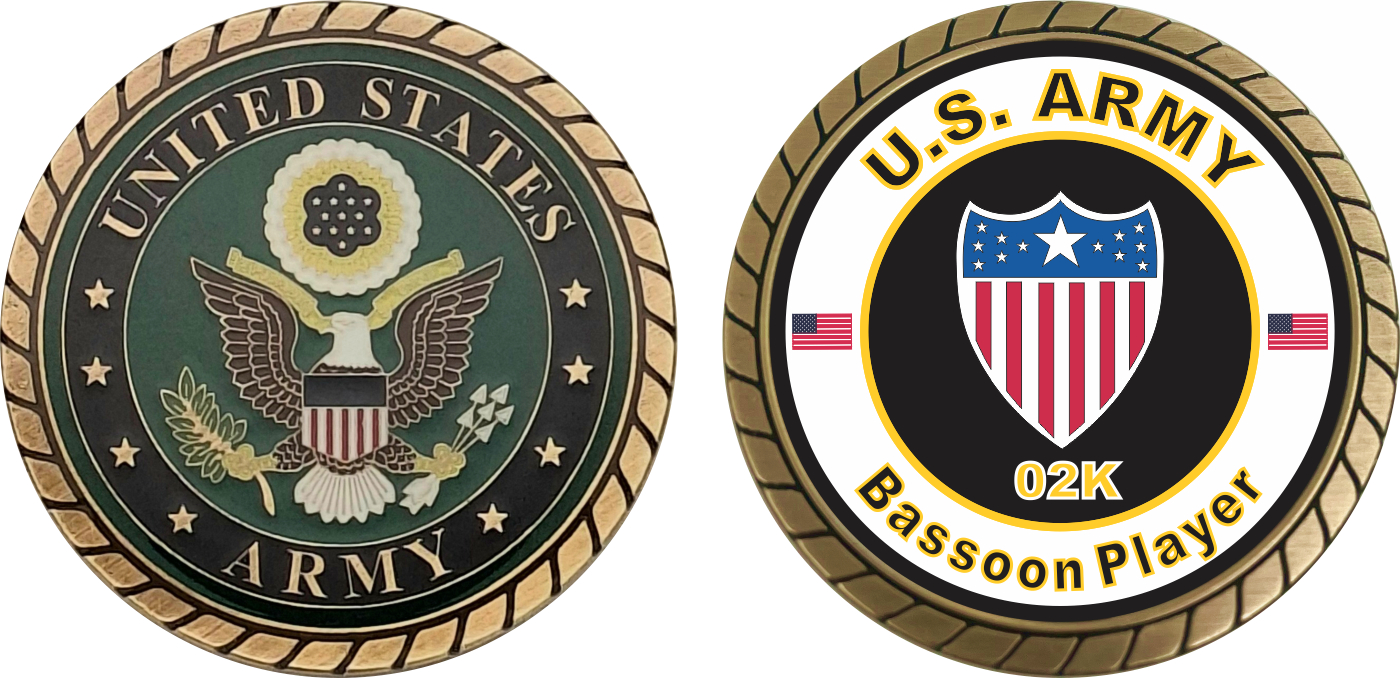 This 1 3/4” U.S. Army MOS 02K Bassoon Player Challenge Coin is proudly offered by Militarybest. This Officially Licensed Army MOS coin has beautiful enamel finish on one side and an organized crisp clean 02K Bassoon Player designation on the opposite side.
