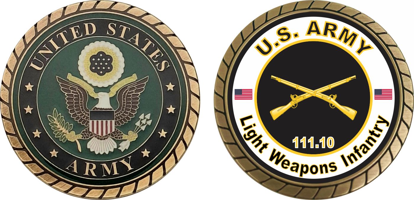 This 1 3/4” U.S. Army MOS 111.10 Light Weapons Infantry Challenge Coin is proudly offered by Militarybest. This Officially Licensed Army MOS coin has beautiful enamel finish on one side and an organized crisp clean 111.10 Light Weapons Infantry designation on the opposite side.