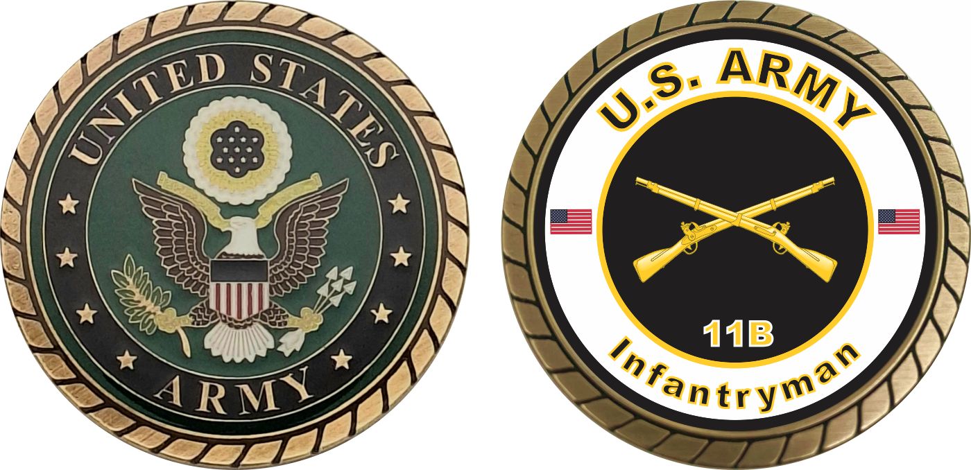 This 1 3/4” U.S. Army MOS 11B Infantryman Challenge Coin is proudly offered by Militarybest. This Officially Licensed Army MOS coin has beautiful enamel finish on one side and an organized crisp clean 11B Infantryman designation on the opposite side.