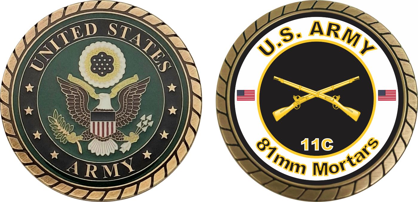 This 1 3/4” U.S. Army MOS 11C 81mm Mortars Challenge Coin is proudly offered by Militarybest. This Officially Licensed Army MOS coin has beautiful enamel finish on one side and an organized crisp clean 11C 81mm Mortars designation on the opposite side.