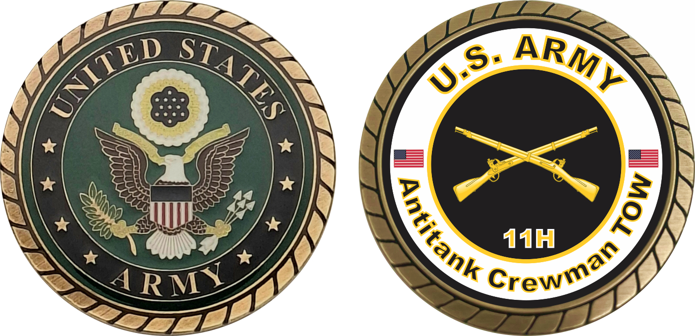 This 1 3/4” U.S. Army MOS 11H Antitank Crewman TOW Challenge Coin is proudly offered by Militarybest. This Officially Licensed Army MOS coin has beautiful enamel finish on one side and an organized crisp clean 11H Antitank Crewman TOW designation on the opposite side.