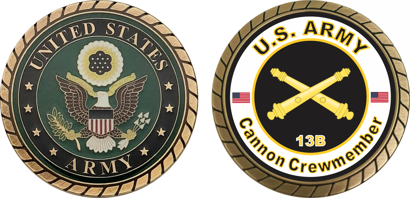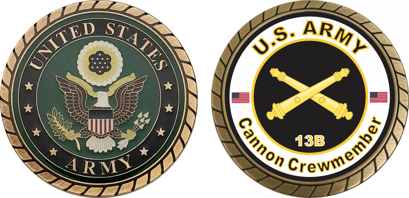 This 1 3/4” U.S. Army MOS 13B Cannon Crewmember Challenge Coin is proudly offered by Militarybest. This Officially Licensed Army MOS coin has beautiful enamel finish on one side and an organized crisp clean 13B Cannon Crewmember designation on the opposite side.