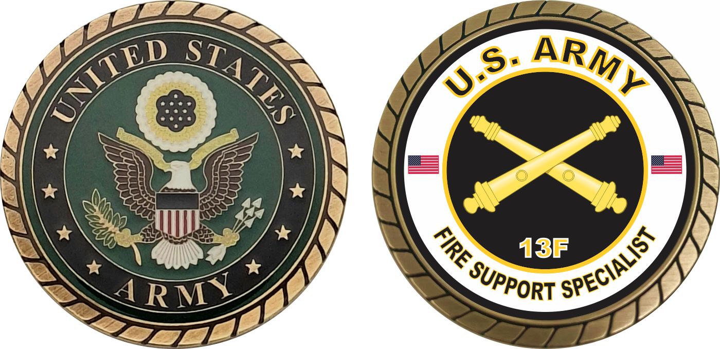 This 1 3/4” U.S. Army MOS 13F Fire Support Specialist Challenge Coin is proudly offered by Militarybest. This Officially Licensed Army MOS coin has beautiful enamel finish on one side and an organized crisp clean 13F Fire Support Specialist designation on the opposite side.
