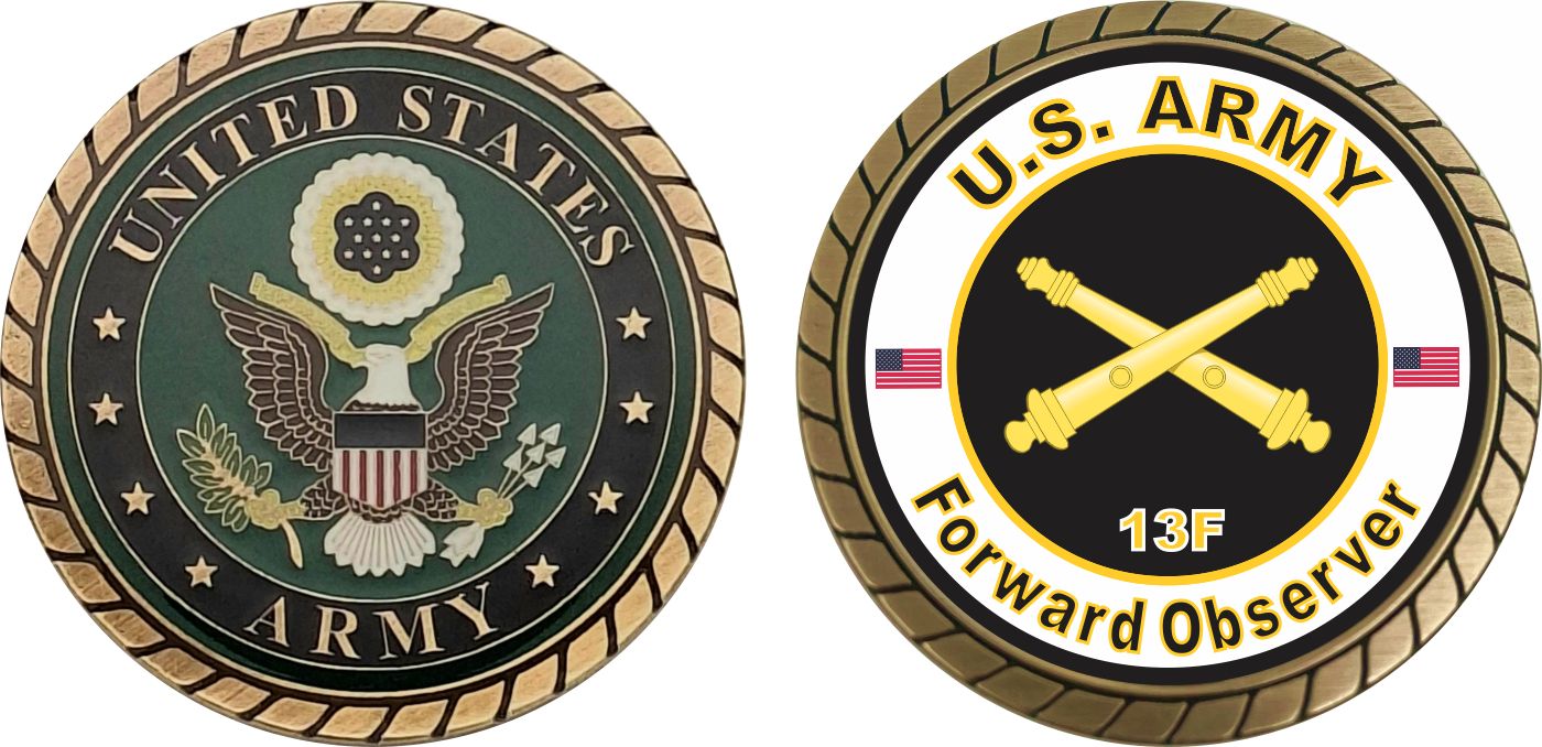 This 1 3/4” U.S. Army MOS 13F Forward Observer Challenge Coin is proudly offered by Militarybest. This Officially Licensed Army MOS coin has beautiful enamel finish on one side and an organized crisp clean 13F Forward Observer designation on the opposite side.