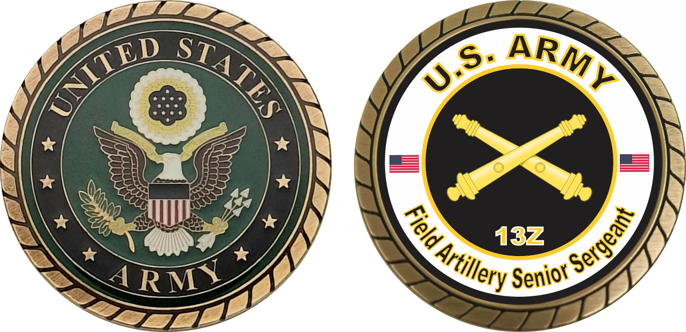 This 1 3/4” U.S. Army MOS 13Z Field Artillery Senior Sergeant Challenge Coin is proudly offered by Militarybest. This Officially Licensed Army MOS coin has beautiful enamel finish on one side and an organized crisp clean 13Z Field Artillery Senior Sergeant designation on the opposite side.