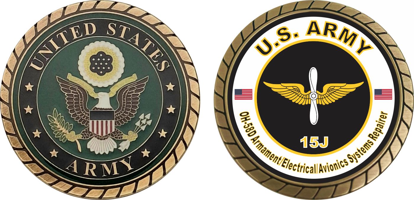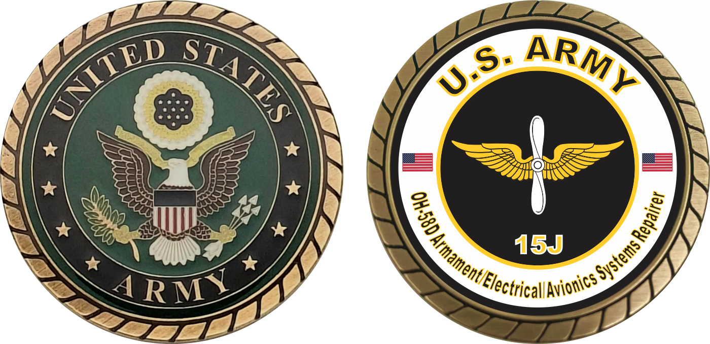 This 1 3/4” U.S. Army MOS 15J OH-58D Armament Electrician Avionics System Repairer Challenge Coin is proudly offered by Militarybest. This Officially Licensed Army MOS coin has beautiful enamel finish on one side and an organized crisp clean 15J OH-58D Armament Electrician Avionics System Repairer designation on the opposite side.