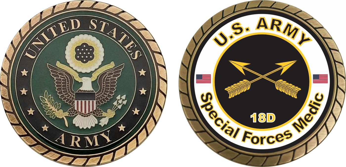 This 1 3/4” U.S. Army MOS 18D Special Forces Medic Challenge Coin is proudly offered by Militarybest. This Officially Licensed Army MOS coin has beautiful enamel finish on one side and an organized crisp clean 18D Special Forces Medic designation on the opposite side.