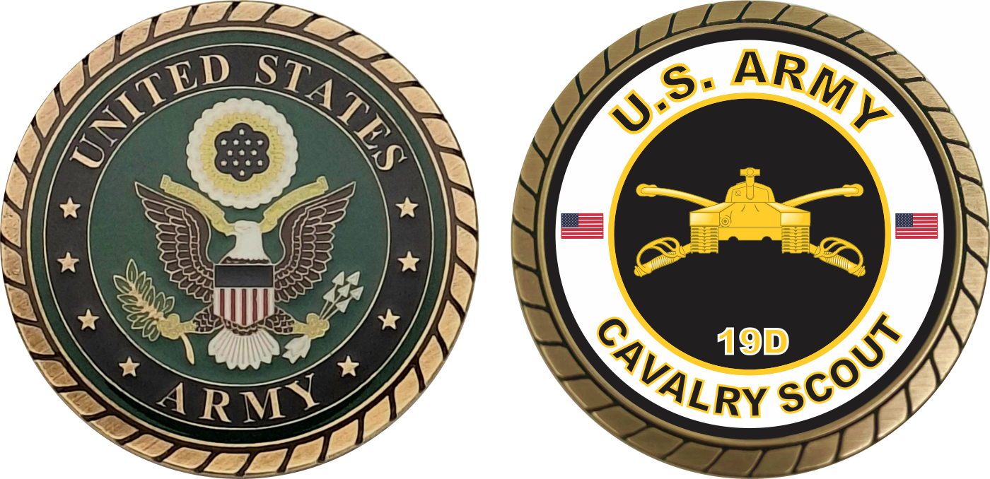 This 1 3/4” U.S. Army MOS 19D Cavalry Scout Challenge Coin is proudly offered by Militarybest. This Officially Licensed Army MOS coin has beautiful enamel finish on one side and an organized crisp clean 19D Cavalry Scout designation on the opposite side.