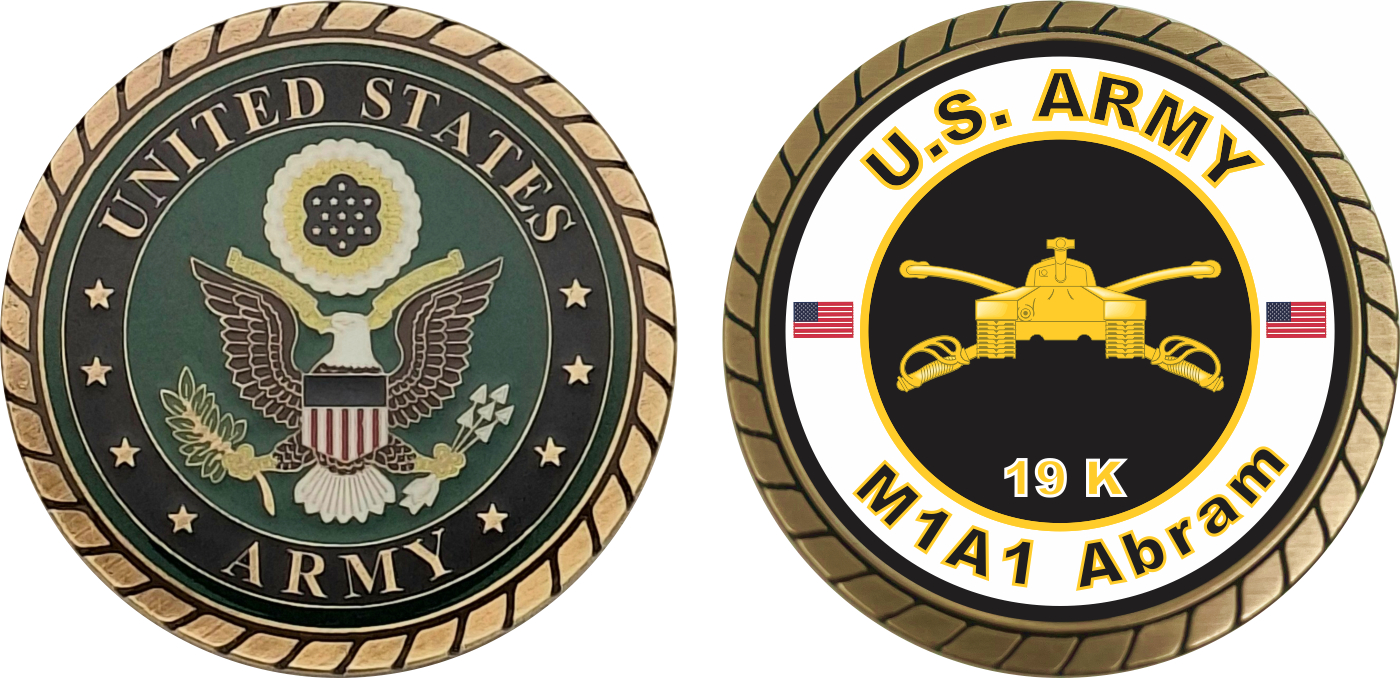 This 1 3/4” U.S. Army MOS 19K M1A1 Abram Challenge Coin is proudly offered by Militarybest. This Officially Licensed Army MOS coin has beautiful enamel finish on one side and an organized crisp clean 19K M1A1 Abram designation on the opposite side.