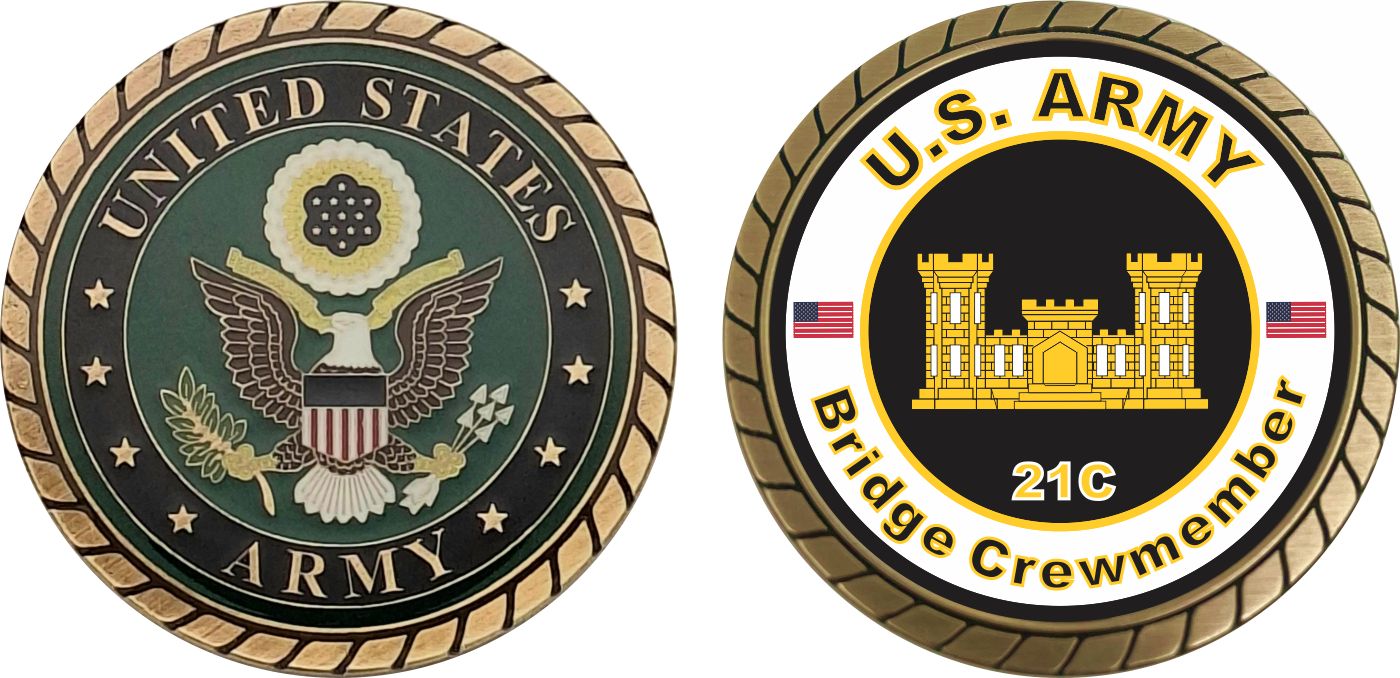 This 1 3/4” U.S. Army MOS 21C Bridge Crewmember Challenge Coin is proudly offered by Militarybest. This Officially Licensed Army MOS coin has beautiful enamel finish on one side and an organized crisp clean 21C Bridge Crewmember designation on the opposite side.