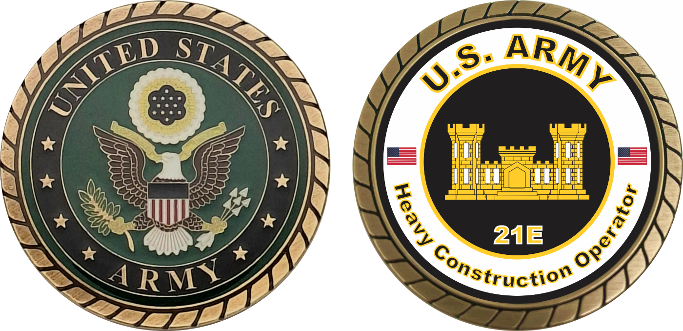 This 1 3/4” U.S. Army MOS 21E Heavy Construction Operator Challenge Coin is proudly offered by Militarybest. This Officially Licensed Army MOS coin has beautiful enamel finish on one side and an organized crisp clean 21E Heavy Construction Operator designation on the opposite side.