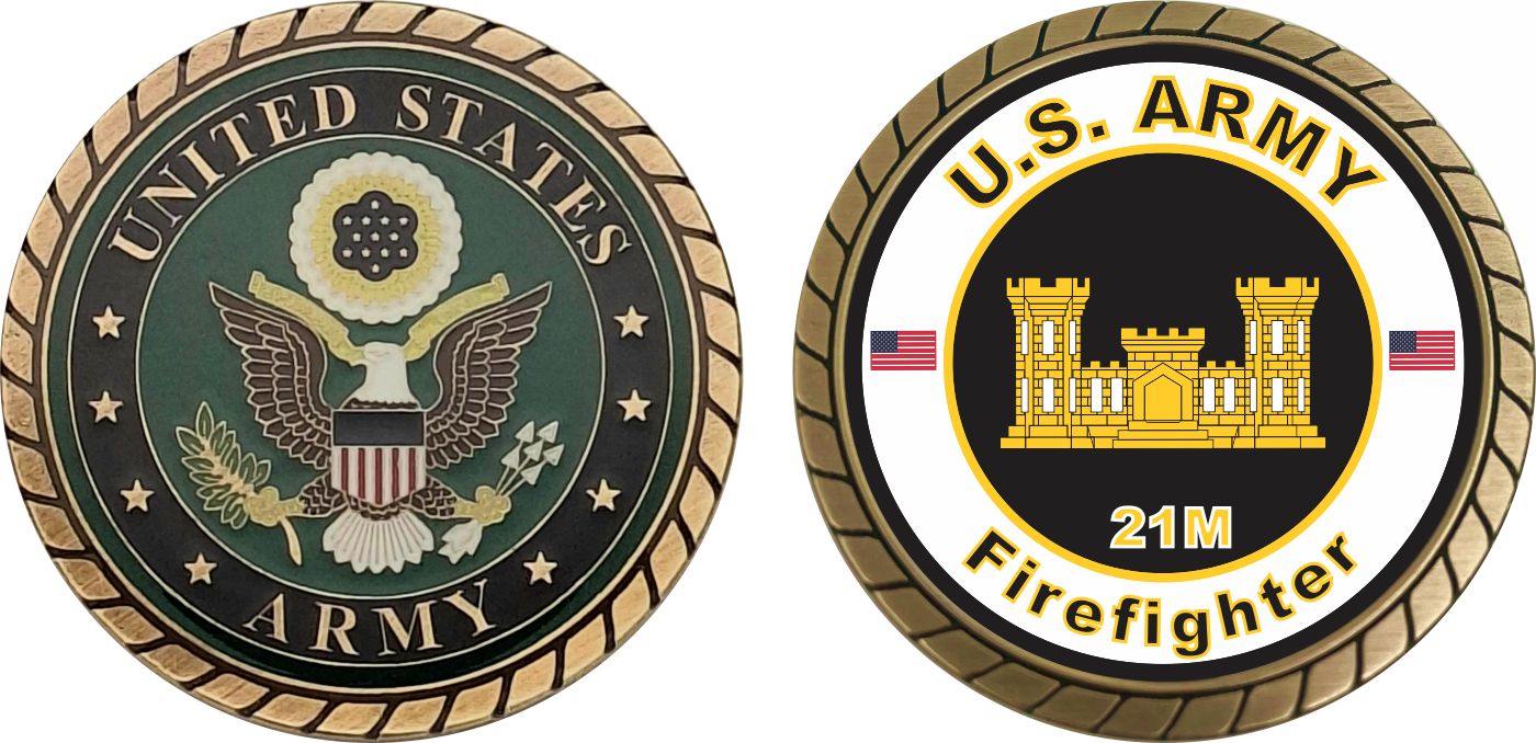 This 1 3/4” U.S. Army MOS 21M Firefighter Challenge Coin is proudly offered by Militarybest. This Officially Licensed Army MOS coin has beautiful enamel finish on one side and an organized crisp clean 21M Firefighter designation on the opposite side.