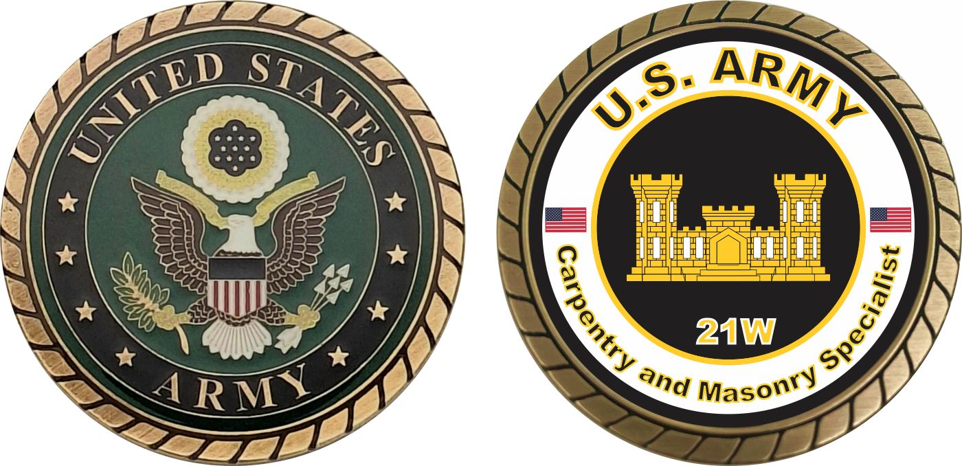 This 1 3/4” U.S. Army MOS 21W Carpentry and Masonry Specialist Challenge Coin is proudly offered by Militarybest. This Officially Licensed Army MOS coin has beautiful enamel finish on one side and an organized crisp clean 21W Carpentry and Masonry Specialist designation on the opposite side.