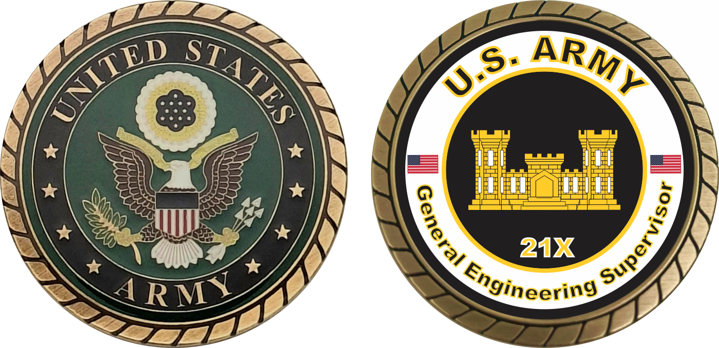 This 1 3/4” U.S. Army MOS 21X General Engineering Supervisor Challenge Coin is proudly offered by Militarybest. This Officially Licensed Army MOS coin has beautiful enamel finish on one side and an organized crisp clean 21X General Engineering Supervisor designation on the opposite side.