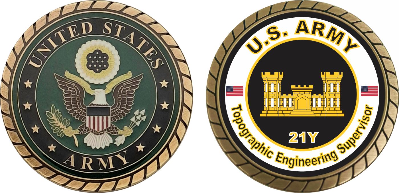 This 1 3/4” U.S. Army MOS 21Y Topographic Engineering Supervisor Challenge Coin is proudly offered by Militarybest. This Officially Licensed Army MOS coin has beautiful enamel finish on one side and an organized crisp clean 21Y Topographic Engineering Supervisor designation on the opposite side.