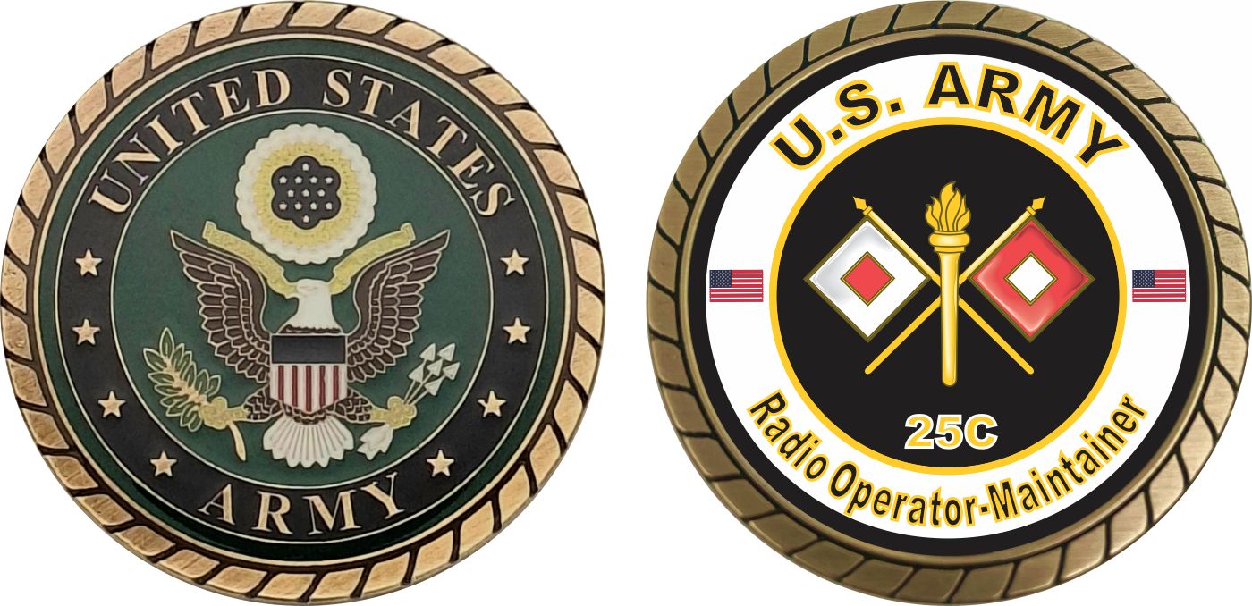 This 1 3/4” U.S. Army MOS 25C Radio Operator-Maintainer Challenge Coin is proudly offered by Militarybest. This Officially Licensed Army MOS coin has beautiful enamel finish on one side and an organized crisp clean 25C Radio Operator-Maintainer designation on the opposite side.