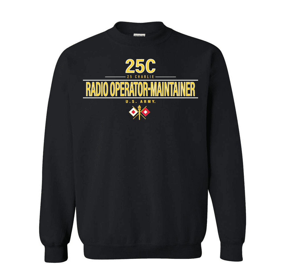 Please enjoy this U.S. Army MOS 25c Radio Operator Maintainer Sweatshirt. The design on this shirt is printed directly to the shirt selected, and is Proudly Printed in the USA. It is 100% pre shrunk shirt and is available in S, M, L, XL, 2X and 3X sizes. As with all of our products this shirt carries a 100% customer satisfaction guarantee.FedEx is not a valid shipping option for this item, if FedEx is selected at checkout UPS will be used instead.