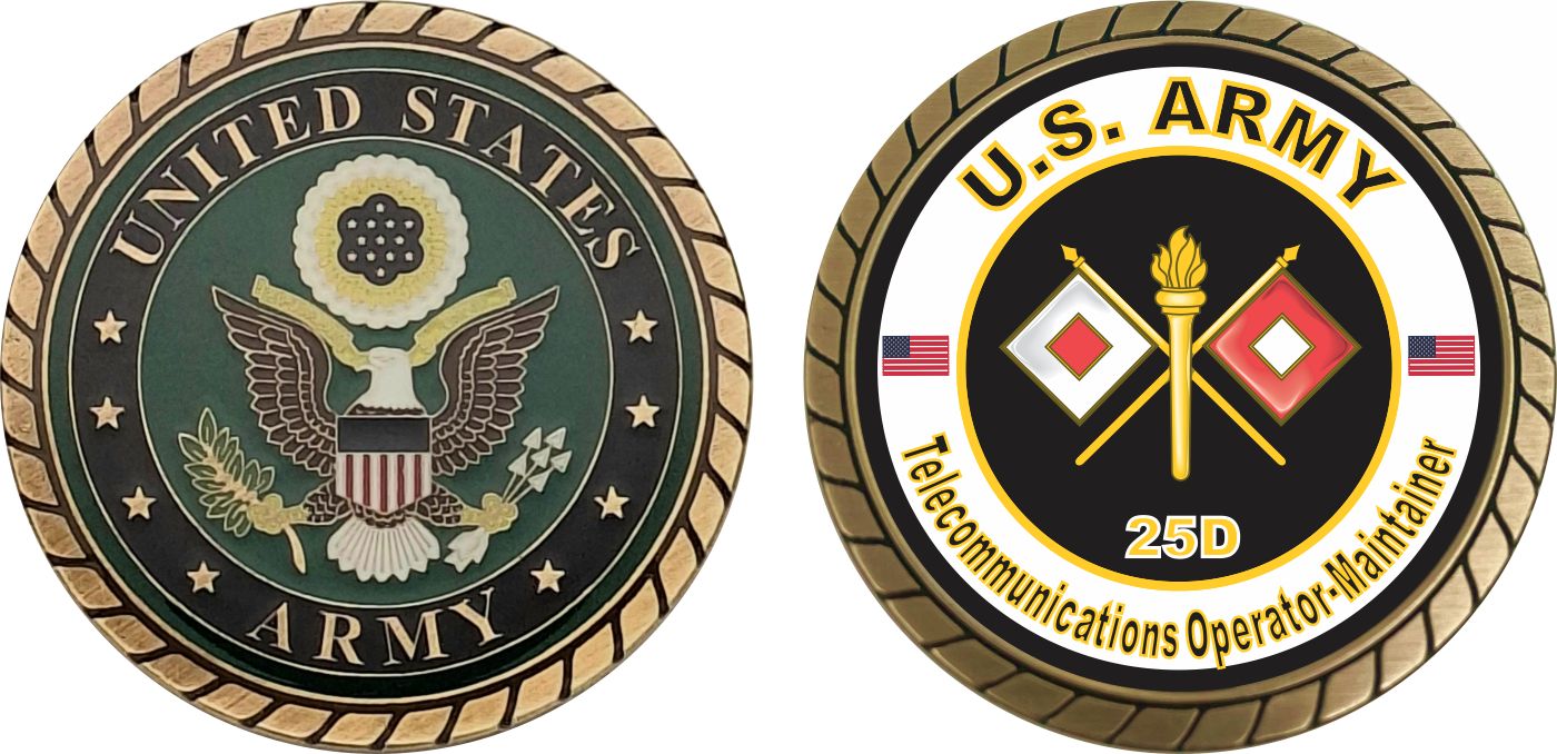 This 1 3/4” U.S. Army MOS 25D Telecommunications Operator-Maintainer Challenge Coin is proudly offered by Militarybest. This Officially Licensed Army MOS coin has beautiful enamel finish on one side and an organized crisp clean 25D Telecommunications Operator-Maintainer designation on the opposite side.
