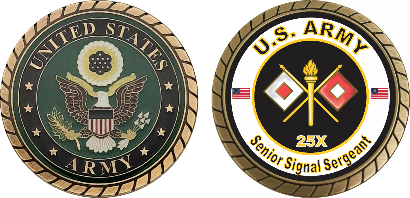 This 1 3/4” U.S. Army MOS 25X Senior Signal Sergeant Challenge Coin is proudly offered by Militarybest. This Officially Licensed Army MOS coin has beautiful enamel finish on one side and an organized crisp clean 25X Senior Signal Sergeant designation on the opposite side.