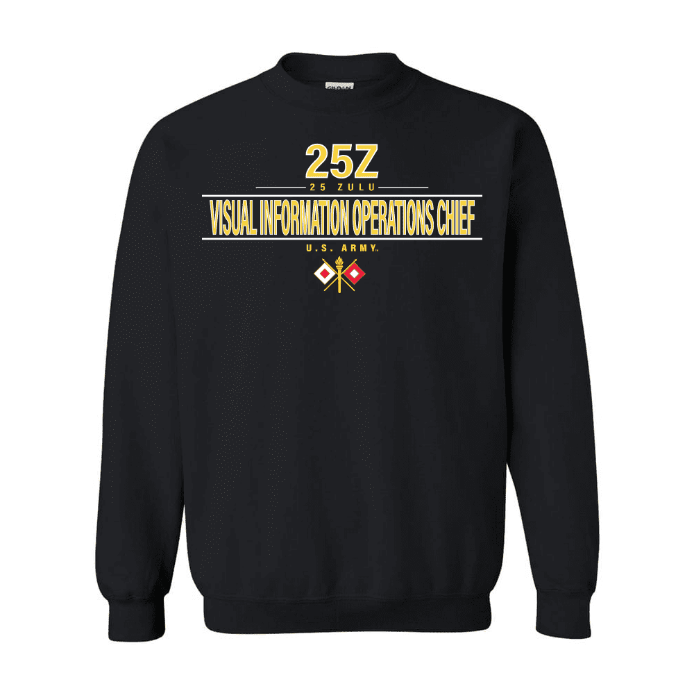 Please enjoy this U.S. Army MOS 25z Visual Information Operations Chief Sweatshirt. The design on this shirt is printed directly to the shirt selected, and is Proudly Printed in the USA. It is 100% pre shrunk shirt and is available in S, M, L, XL, 2X and 3X sizes. As with all of our products this shirt carries a 100% customer satisfaction guarantee.FedEx is not a valid shipping option for this item, if FedEx is selected at checkout UPS will be used instead.
