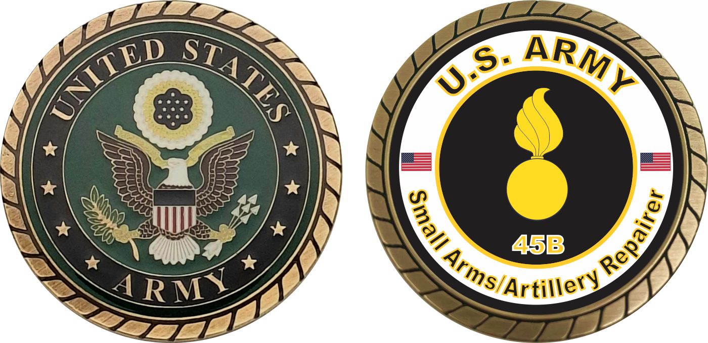 This 1 3/4” U.S. Army MOS 45B Small Arms Artillery Repairer Challenge Coin is proudly offered by Militarybest. This Officially Licensed Army MOS coin has beautiful enamel finish on one side and an organized crisp clean 45B Small Arms Artillery Repairer designation on the opposite side.