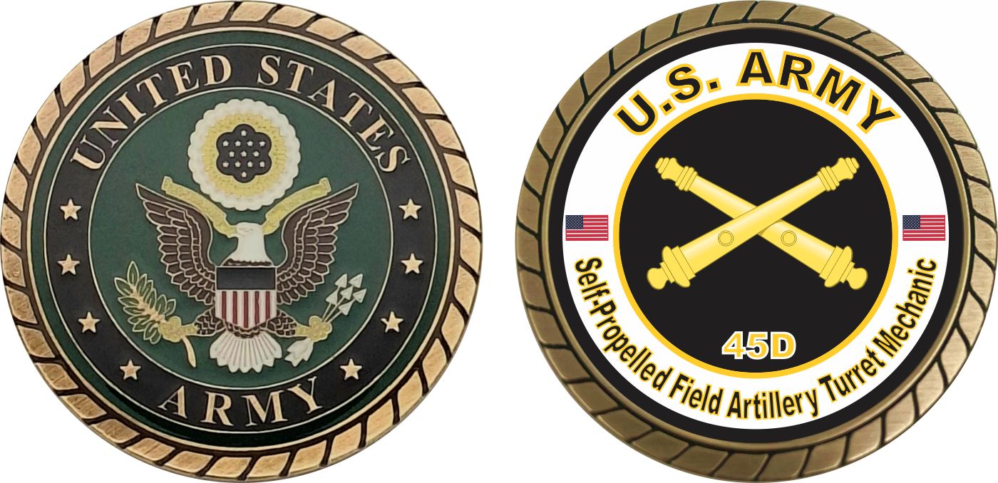 This 1 3/4” U.S. Army MOS 45D Self-Propelled Field Artillery Turret Mechanic Challenge Coin is proudly offered by Militarybest. This Officially Licensed Army MOS coin has beautiful enamel finish on one side and an organized crisp clean 45D Self-Propelled Field Artillery Turret Mechanic designation on the opposite side.