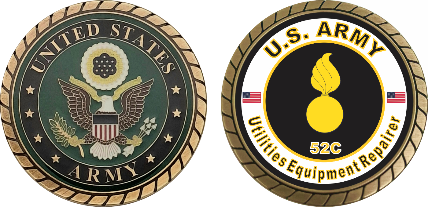 This 1 3/4” U.S. Army MOS 52C Utilities Equipment Repairer Challenge Coin is proudly offered by Militarybest. This Officially Licensed Army MOS coin has beautiful enamel finish on one side and an organized crisp clean 52C Utilities Equipment Repairer designation on the opposite side.