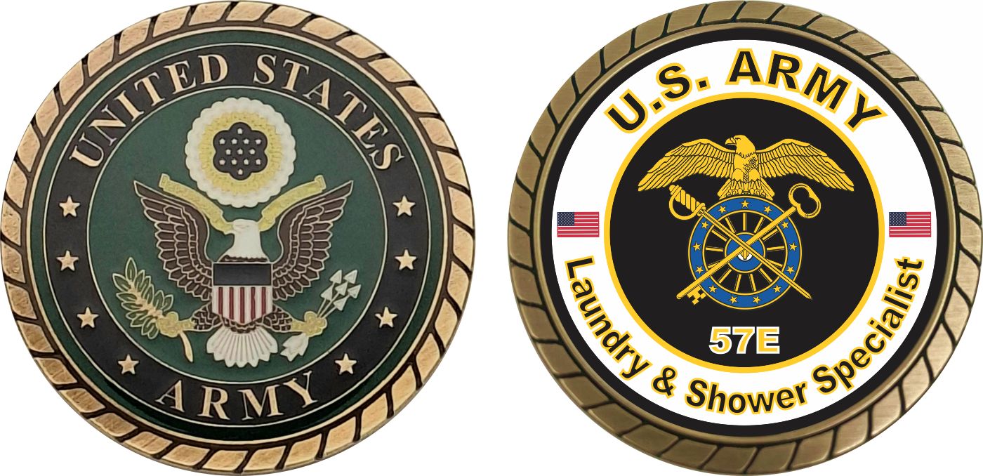 This 1 3/4” U.S. Army MOS 57E Laundry and Shower Specialist Challenge Coin is proudly offered by Militarybest. This Officially Licensed Army MOS coin has beautiful enamel finish on one side and an organized crisp clean 57E Laundry and Shower Specialist designation on the opposite side.