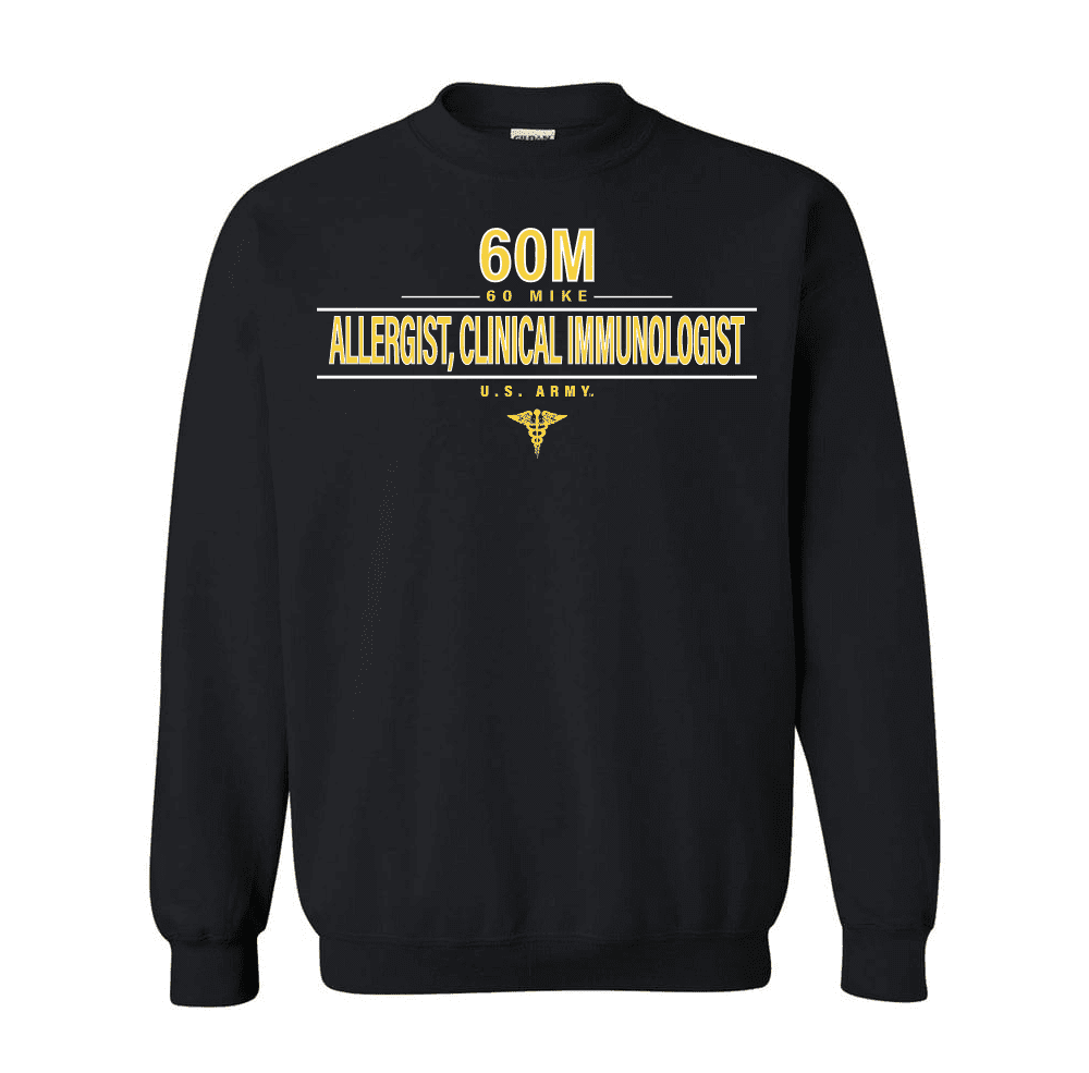 Please enjoy this U.S. Army MOS 60m Allergist Clinical Immunologist Sweatshirt. The design on this shirt is printed directly to the shirt selected, and is Proudly Printed in the USA. It is 100% pre shrunk shirt and is available in S, M, L, XL, 2X and 3X sizes. As with all of our products this shirt carries a 100% customer satisfaction guarantee.FedEx is not a valid shipping option for this item, if FedEx is selected at checkout UPS will be used instead.
