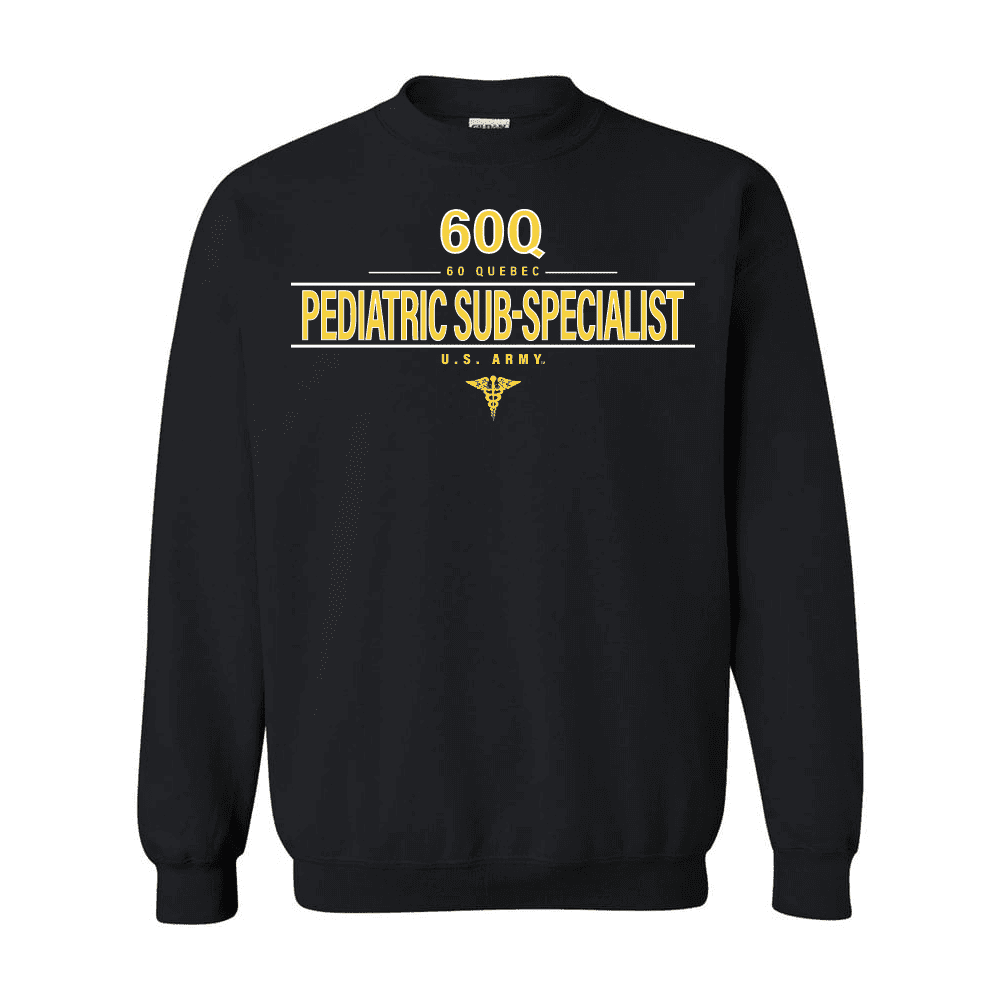 Please enjoy this U.S. Army MOS 60q Pediatric Sub Specialist Sweatshirt. The design on this shirt is printed directly to the shirt selected, and is Proudly Printed in the USA. It is 100% pre shrunk shirt and is available in S, M, L, XL, 2X and 3X sizes. As with all of our products this shirt carries a 100% customer satisfaction guarantee.FedEx is not a valid shipping option for this item, if FedEx is selected at checkout UPS will be used instead.