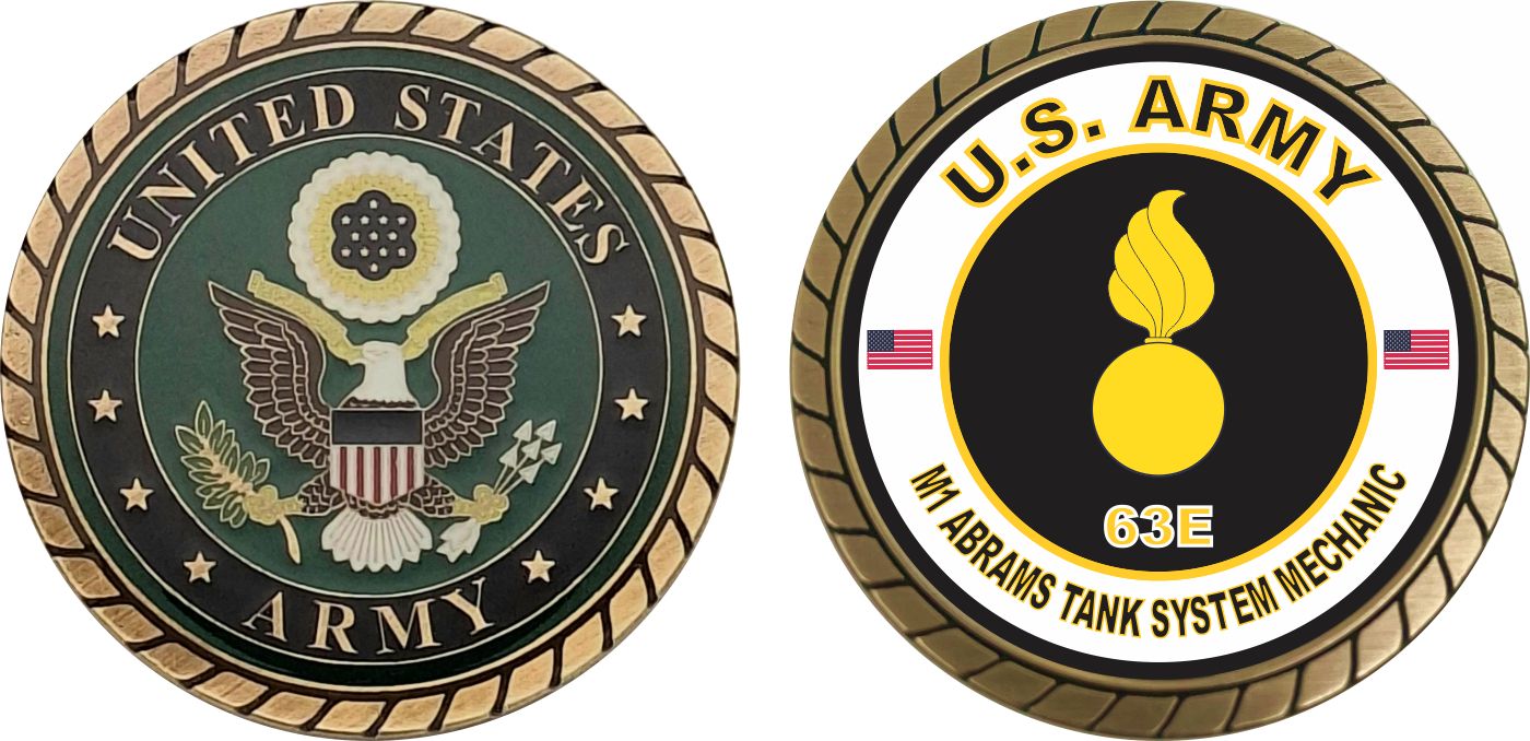 This 1 3/4” U.S. Army MOS 63E M1 Abrams Tank System Mechanic Challenge Coin is proudly offered by Militarybest. This Officially Licensed Army MOS coin has beautiful enamel finish on one side and an organized crisp clean 63E M1 Abrams Tank System Mechanic designation on the opposite side.