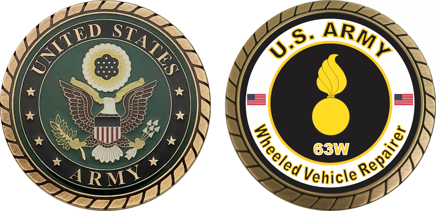 This 1 3/4” U.S. Army MOS 63W Wheeled Vehicle Repairer Challenge Coin is proudly offered by Militarybest. This Officially Licensed Army MOS coin has beautiful enamel finish on one side and an organized crisp clean 63W Wheeled Vehicle Repairer designation on the opposite side.