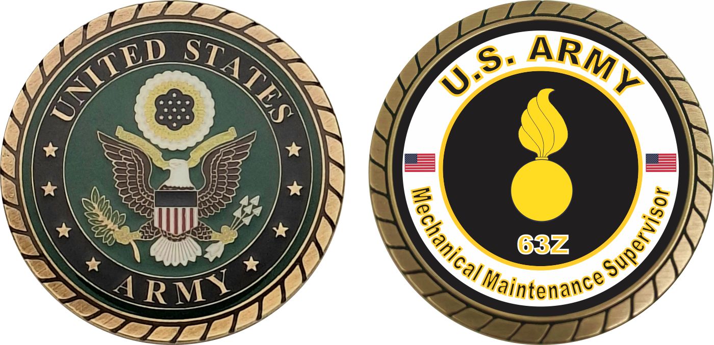 This 1 3/4” U.S. Army MOS 63Z Mechanical Maintenance Supervisor Challenge Coin is proudly offered by Militarybest. This Officially Licensed Army MOS coin has beautiful enamel finish on one side and an organized crisp clean 63Z Mechanical Maintenance Supervisor designation on the opposite side.