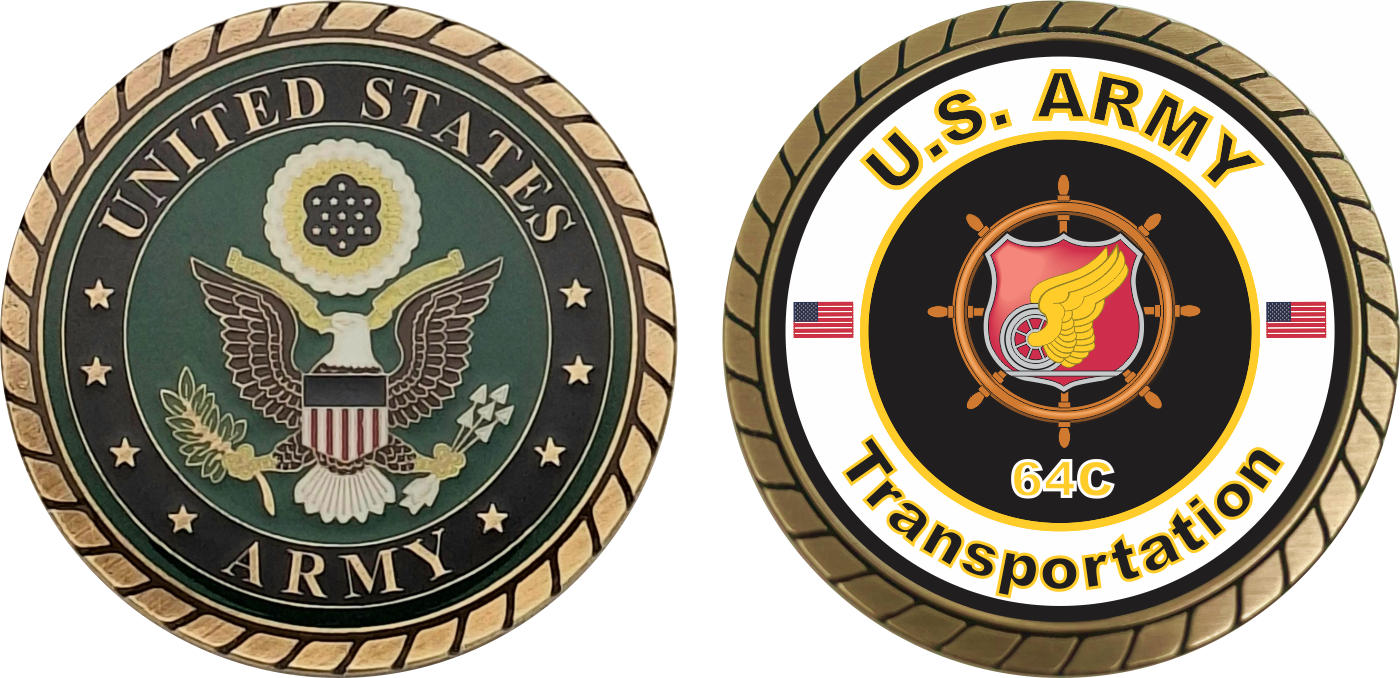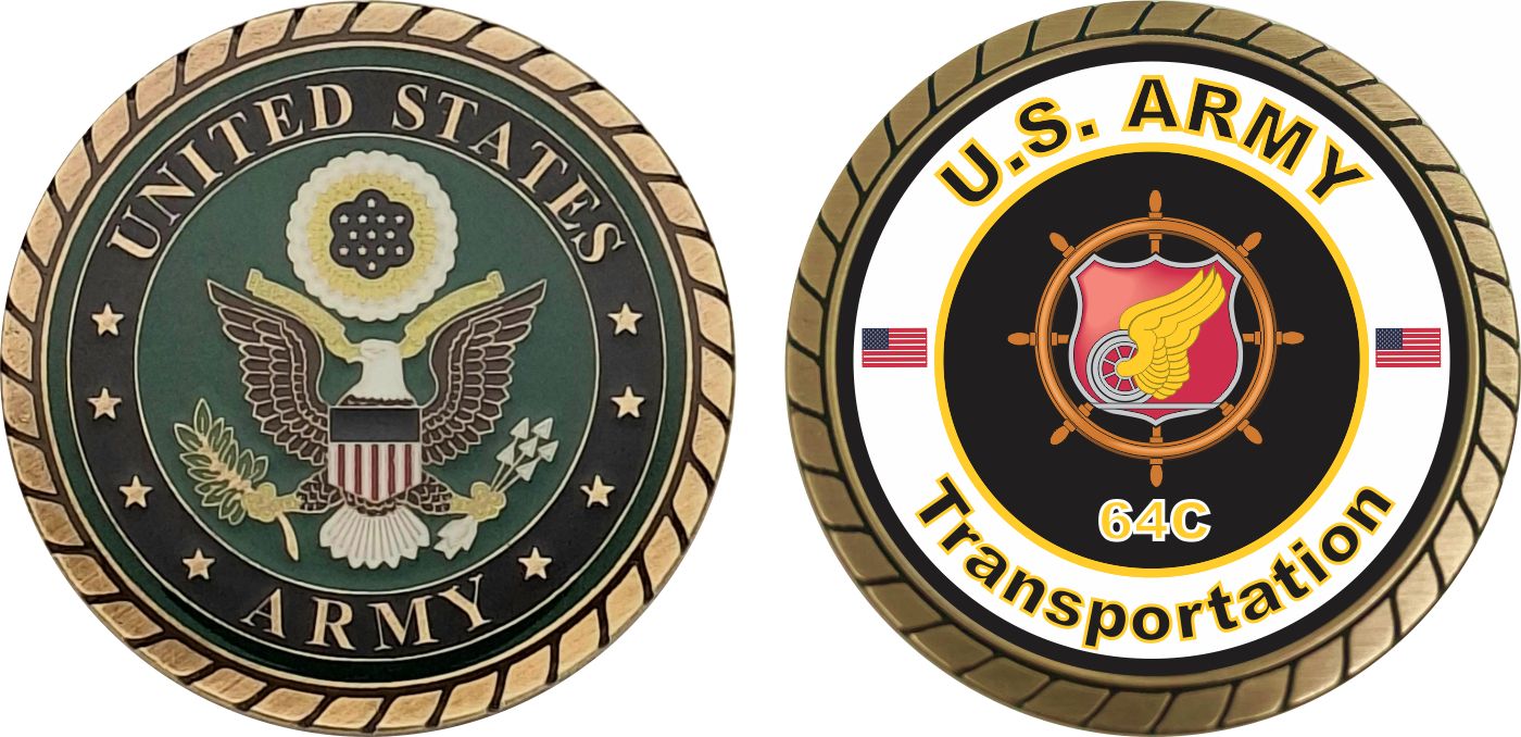 This 1 3/4” U.S. Army MOS 64C Transportation Challenge Coin is proudly offered by Militarybest. This Officially Licensed Army MOS coin has beautiful enamel finish on one side and an organized crisp clean 64C Transportation designation on the opposite side.