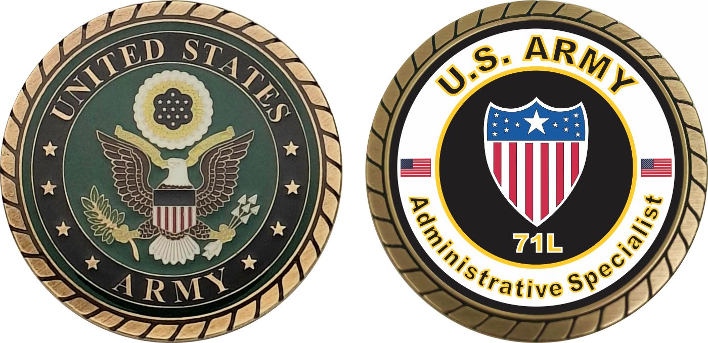This 1 3/4” U.S. Army MOS 71L Administrative Specialist Challenge Coin is proudly offered by Militarybest. This Officially Licensed Army MOS coin has beautiful enamel finish on one side and an organized crisp clean 71L Administrative Specialist designation on the opposite side.