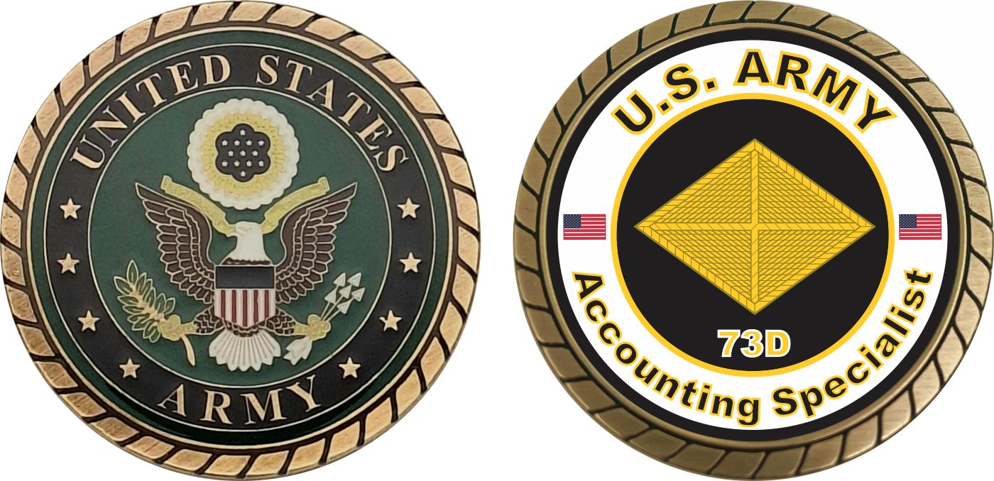 This 1 3/4” U.S. Army MOS 73D Accounting Specialist Challenge Coin is proudly offered by Militarybest. This Officially Licensed Army MOS coin has beautiful enamel finish on one side and an organized crisp clean 73D Accounting Specialist designation on the opposite side.