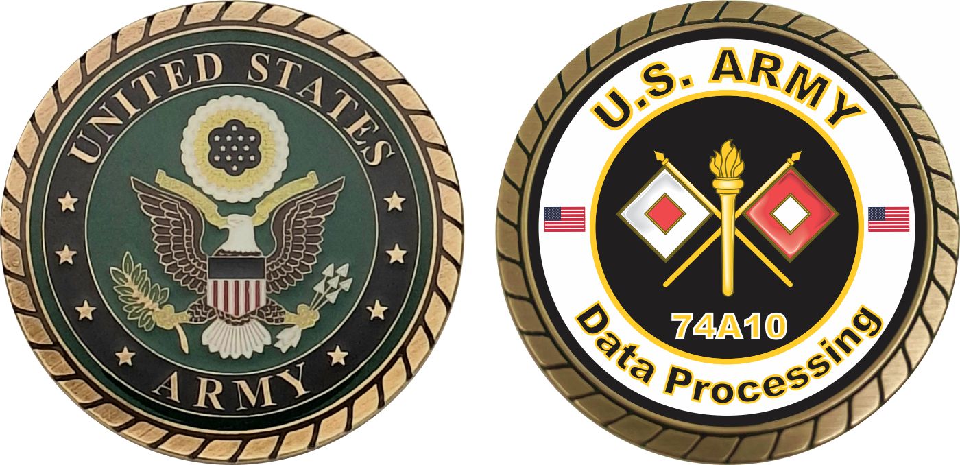 This 1 3/4” U.S. Army MOS 74A10 Data Processing Challenge Coin is proudly offered by Militarybest. This Officially Licensed Army MOS coin has beautiful enamel finish on one side and an organized crisp clean 74A10 Data Processing designation on the opposite side.
