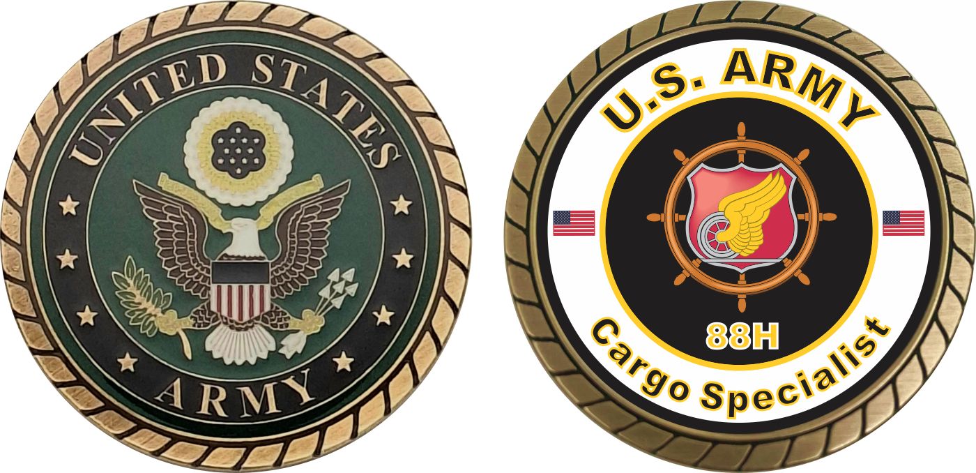 This 1 3/4” U.S. Army MOS 88H Cargo Specialist Challenge Coin is proudly offered by Militarybest. This Officially Licensed Army MOS coin has beautiful enamel finish on one side and an organized crisp clean 88H Cargo Specialist designation on the opposite side.