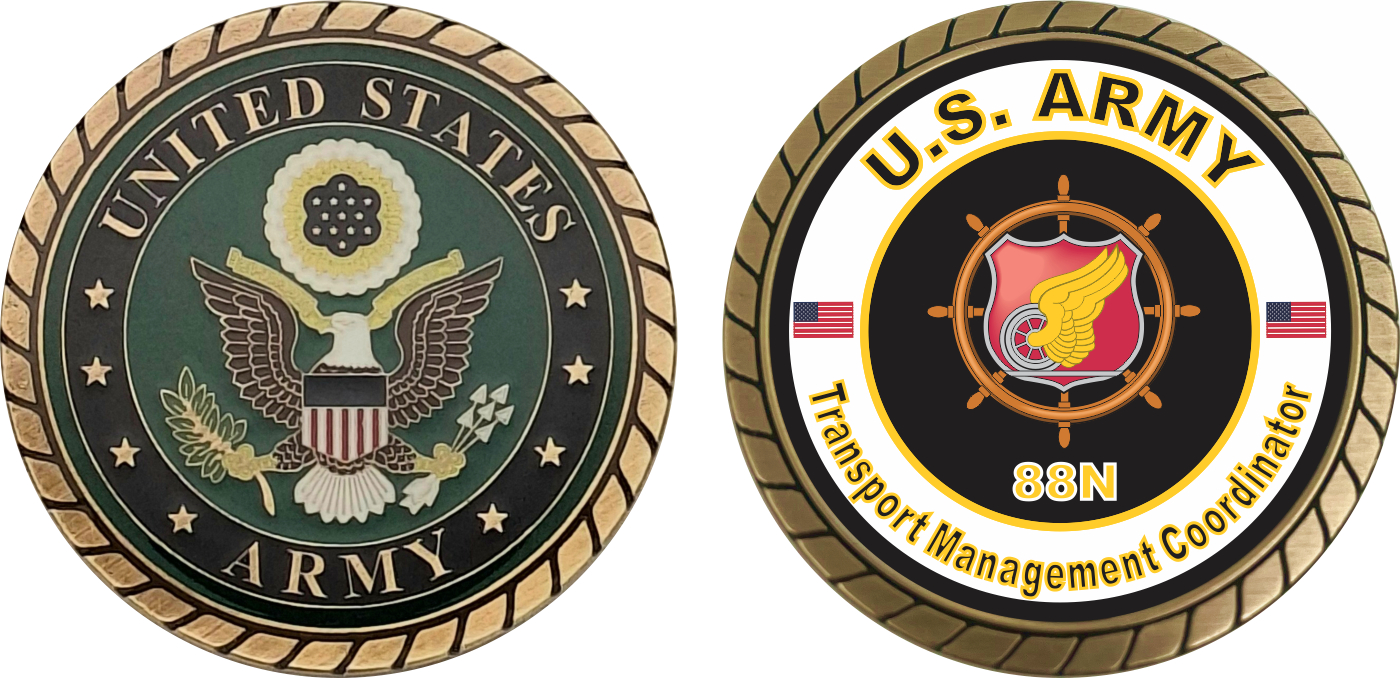 This 1 3/4” U.S. Army MOS 88N Transport Management Coordinator Challenge Coin is proudly offered by Militarybest. This Officially Licensed Army MOS coin has beautiful enamel finish on one side and an organized crisp clean 88N Transport Management Coordinator designation on the opposite side.