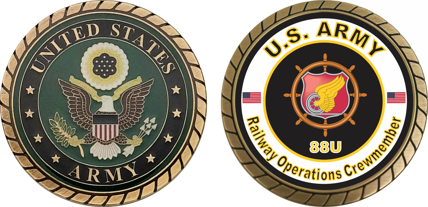 This 1 3/4” U.S. Army MOS 88U Railway Operations Crewmember Challenge Coin is proudly offered by Militarybest. This Officially Licensed Army MOS coin has beautiful enamel finish on one side and an organized crisp clean 88U Railway Operations Crewmember designation on the opposite side.