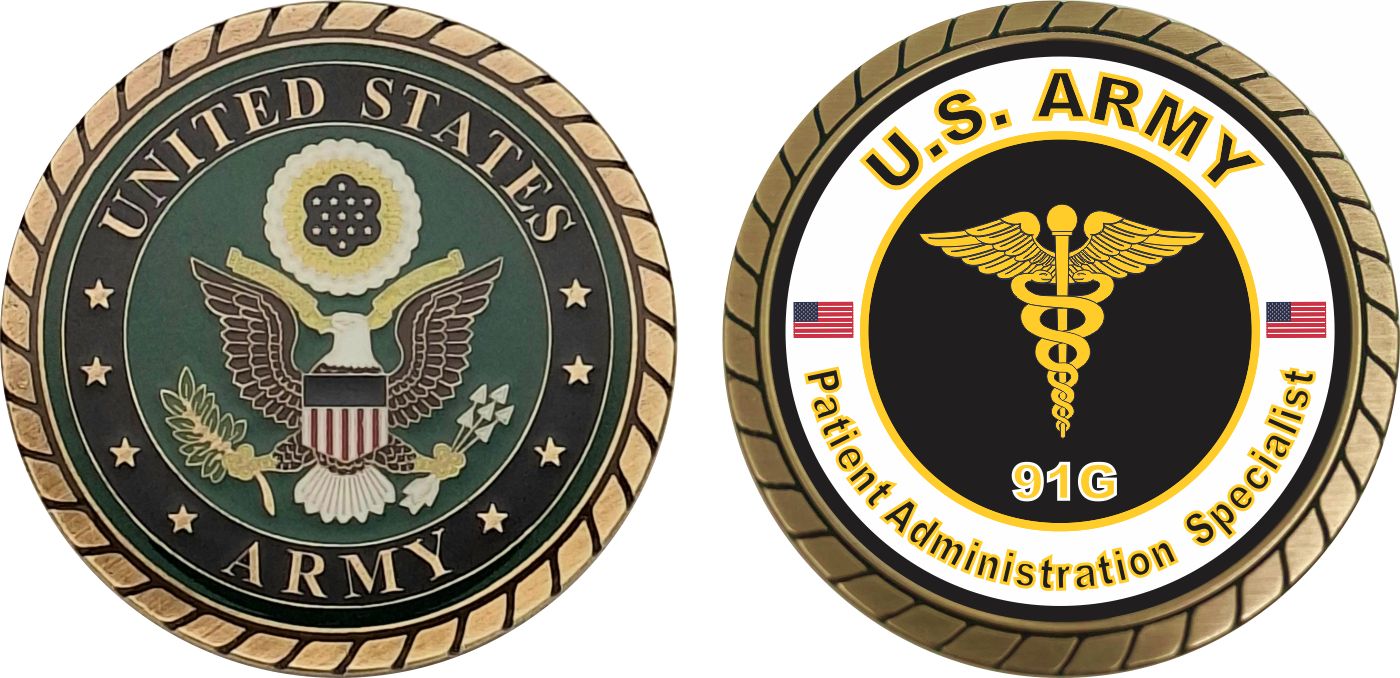 This 1 3/4” U.S. Army MOS 91G Patient Administration Specialist Challenge Coin is proudly offered by Militarybest. This Officially Licensed Army MOS coin has beautiful enamel finish on one side and an organized crisp clean 91G Patient Administration Specialist designation on the opposite side.
