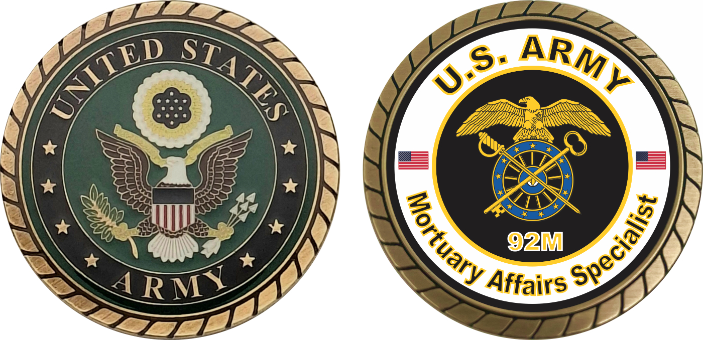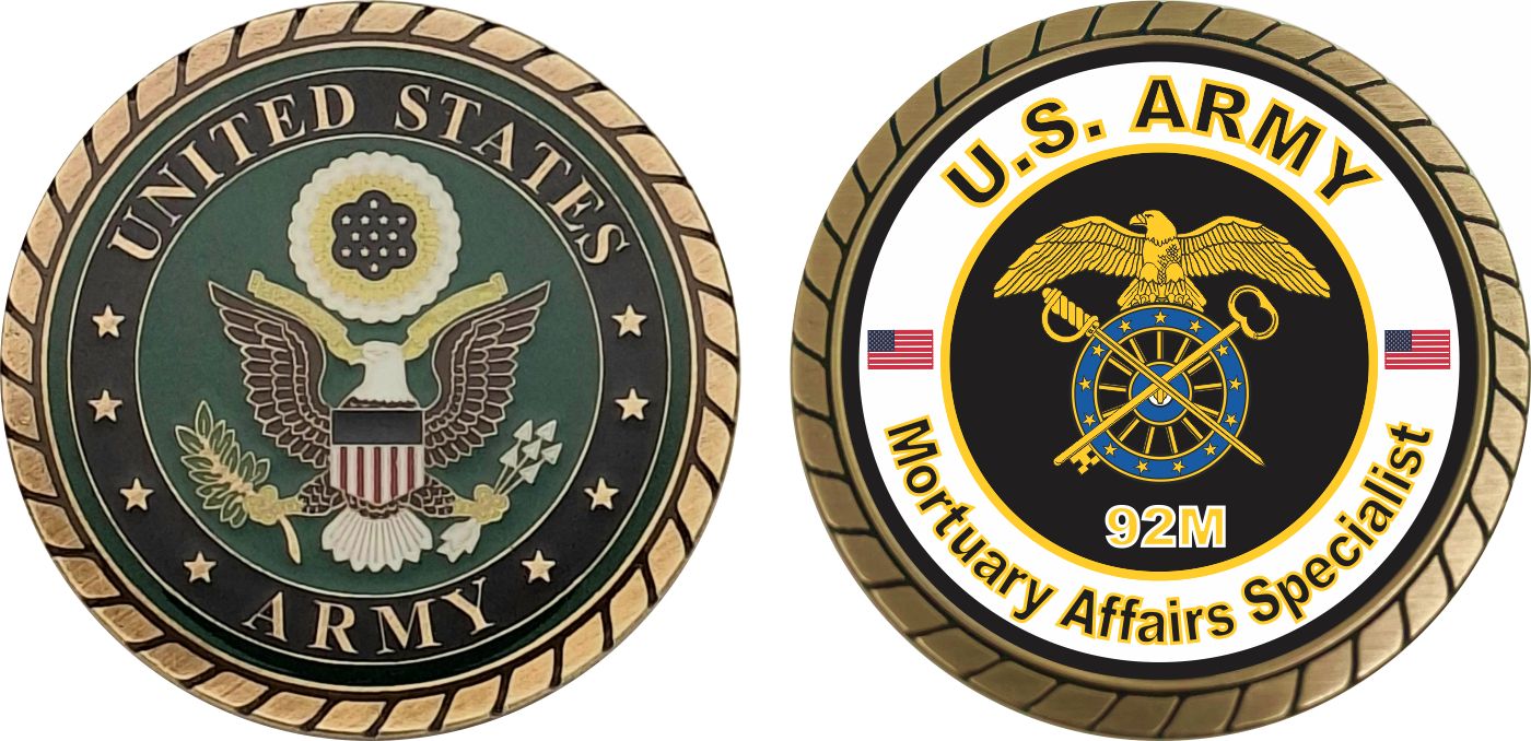 This 1 3/4” U.S. Army MOS 92M Mortuary Affairs Specialist Challenge Coin is proudly offered by Militarybest. This Officially Licensed Army MOS coin has beautiful enamel finish on one side and an organized crisp clean 92M Mortuary Affairs Specialist designation on the opposite side.