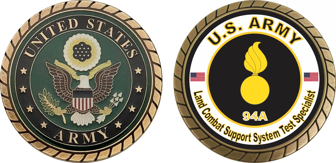 This 1 3/4” U.S. Army MOS 94A Land Combat Support System Test Specialist Challenge Coin is proudly offered by Militarybest. This Officially Licensed Army MOS coin has beautiful enamel finish on one side and an organized crisp clean 94A Land Combat Support System Test Specialist designation on the opposite side.
