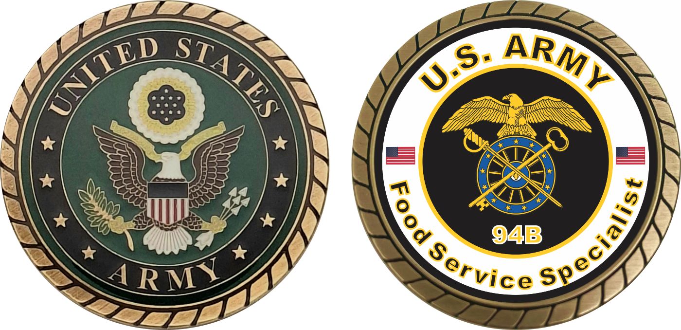 This 1 3/4” U.S. Army MOS 94B Food Service Specialist Challenge Coin is proudly offered by Militarybest. This Officially Licensed Army MOS coin has beautiful enamel finish on one side and an organized crisp clean 94B Food Service Specialist designation on the opposite side.